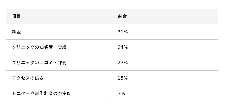 - クリニック選びの際に重視した点は「料金」(31%)が最多。「クリニックの知名度・実績」(24%)、「クリニックの口コミ・評判」(27%)も多く、費用対効果を重視する傾向