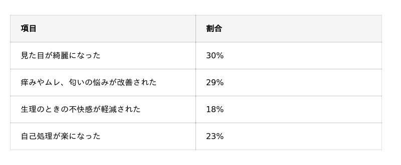 - 施術を受けてよかったことは「見た目が綺麗になった」(30%)、「痒みやムレ、匂いの悩みが改善された」(29%)など様々