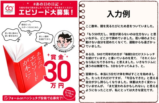 当社は2025年10月に創業60周年を迎えました。この節目を記念し、これまでも、これからも一人ひとりの人生に向き合い続けていく姿勢を、あらためて大切にしたいと考えました。その想いを形にするため、「"あなた"の人生初」をコンセプトにした様々な企画を2026年9月まで展開しております。本キャンペーンは、その第2弾として、「人生初」に踏み出したあの日の日記と題してエピソードを一般募集し、誰かの挑戦の背中を押せるような書籍を"みんな"でつくる取り組みです。