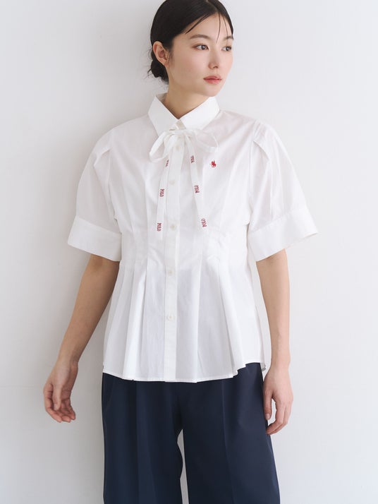 ウエストにタックを施し裾に向かってボリュームを持たせたメリハリシルエットでスタイルアップを叶えるシャツ。大きめの袖口が腕周りを華奢に見せ、暑い時期でも涼しく着用可能。細いタイにはPOLO刺繍を施しアクセントに。タイはウエストやヘアアレンジにも使えるアレンジ可能なデザイン。