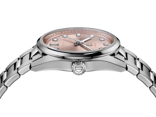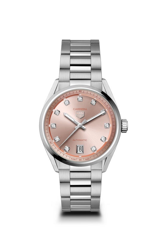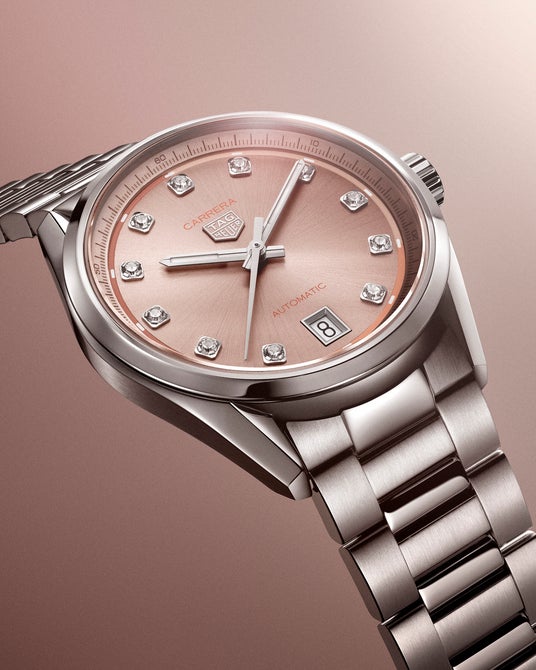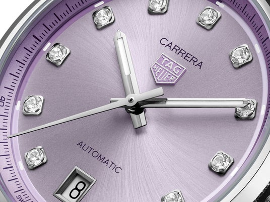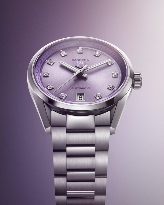 「タグ・ホイヤー カレラ デイト」の新作はそれぞれ個性的な色使いと仕上げによって、エレガンスだけでなく、モダニティも反映するようデザインされています。パウダリーピンクのモデルは、サンレイ加工サテン仕上げのダイヤル、ライラックのモデルは特徴的なスネイル/サテン仕上げのダイヤルが目を引きます。この2つの仕上げにより、それぞれのタイムピースがパステルのカラーパレットの中で独自の個性を発揮し、タイムレスなスタイルやトレンドを意識したスタイルを選ぶことが可能になります。