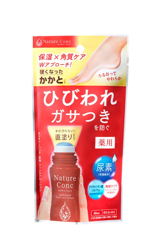 「ネイチャーコンク」は、薬用のふきとり化粧水2種とジェルクリーム2種に加えて、かかとをケアする「薬用 フットケアローション(販売名:薬用ローションS8)」の5品のラインナップで、すべて医薬部外品で構成されるブランドです。顔用スキンケアの4品以外に「フットケアローション」がラインナップされていることは一般のユーザーにも実はあまり知られていませんが、「ネイチャーコンク」は、当社の約90年に及ぶ角層研究から生まれたシリーズであるからこそ投入したアイテムです。身体のなかでも最も角層の厚い部位であるかかとをケアするための「フットケアローション」には、より厚く硬くなったかかとに成分を浸透させることにこだわった処方技術が注ぎ込まれています。