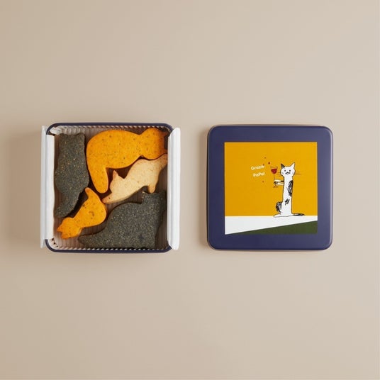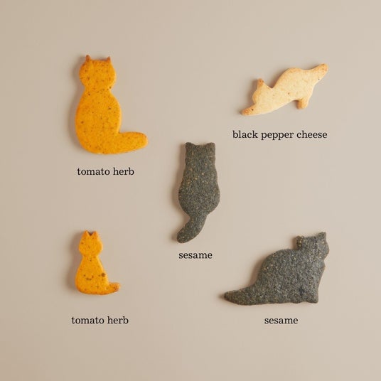 お酒に合う3種類のフレーバーをご用意。ブラックペッパーチーズ(白猫)、トマトハーブ(オレンジ猫)、セサミ(黒猫)のラインナップで5種類のポーズの猫ちゃんが缶に入っています。