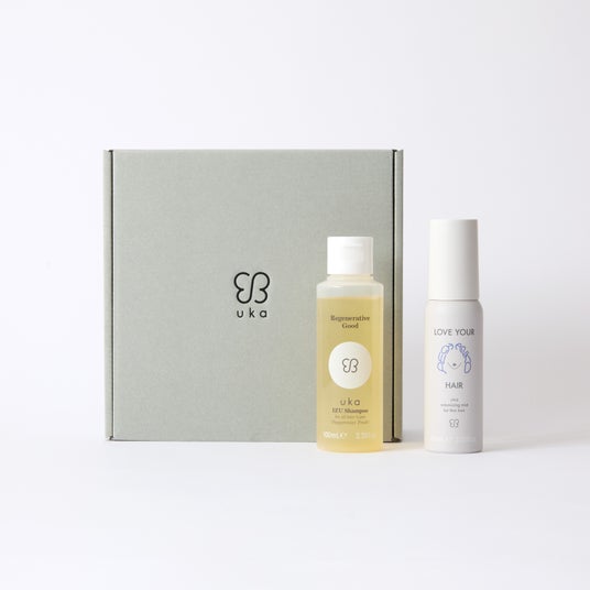 店舗限定セットは、湿気もすっきり爽快感あふれるuka IZU Shampoo for all hair types 'Peppermint Fresh'と揉み込むだけで簡単に立体感が生まれるuka LOVE YOUR FUNYAFUNYA HAIR texturizing wax for flat & fine hair or 根元にハリ・コシをキープするuka LOVE YOUR PECHANKO HAIR volumizing mist for thin hairのセット。
