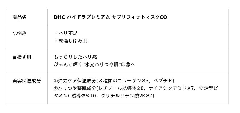 「DHCハイドラプレミアム サプリフィットマスク」は、美容保湿成分の配合設計からシート素材にいたるまで、“肌への届け方”にこだわって開発したシートマスクです。美容保湿成分には、肌悩みに応えるコア成分と、その働きを支えるサポート成分を組み合わせ、透明感※2ケアを意識した「ビタミンC※3」、肌荒れ・ゆらぎケアに着目した「セラミド※4」、ハリと弾力をサポートする「コラーゲン※5」の3つのラインナップを用意。さらに、シートと肌の間に“うるおい保水膜”を形成する独自構造により、美容保湿成分が肌に吸着するように密着。角質層まで惜しみなく届け、毎日のスキンケアに心地よいうるおいの実感をもたらします。