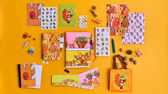 100%ORANGEさんの絵本『おひっこし』イラストレーターユニット100%ORANGEさんが描いた絵本『おひっこし』が、手帳カバーや文具になりました。たくさんのりすたちが、つり橋をわたり、階段を下り、横断歩道を横切ったり‥‥。ぞろぞろといっせいに歩いてゆく姿がなんとも愉快なりすたちが描かれています。