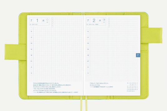 「ほぼ日手帳」にはさまざまな手帳本体があります。定番の1日1ページはオリジナル(A6)とカズン(A5)の2種類。薄くて丈夫な用紙「トモエリバー」、書きやすい「3.7ミリ方眼」、パタンと「180度開く」造本、1日1つずつ掲載された「日々の言葉」などが人気の特徴です。本体に装着して使える手帳カバーは、豊富なラインナップを展開。他にも、カバーと本体が一体になったタイプの「HON」、持ち運びやすいサイズの週間手帳「weeks」、日付を気にせずに使える月間ノート手帳「day-free」、5年分の記録を1冊にまとめられる「ほぼ日5年手帳」などがあります。
