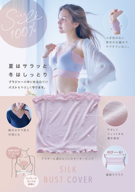 毎日身に着けるブラジャーだからこそ、バストまわりの“ちょっとした不快感”が気になるもの。そんなお悩みに寄り添う新アイテム「シルクのおまもりバストカバー」が登場しました。