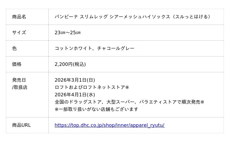 株式会社ディーエイチシー(本社:東京都港区、代表取締役社長:宮崎緑、以下:DHC)は、着圧ソックスシリーズ『バンビーナ スリムレッグ』から、「シアーメッシュハイソックス(スルっとはける)」(2色)を2026年3月1日(日)より生活雑貨を扱う「ロフト」にて先行発売いたします。素材には綿混とメッシュ編みを使用しデザイン性と通気性を追求。従来の履きやすさをそのままに、長時間着用してもしめつけが気になりにくい着圧値に仕上げました。日常使いからリラックスタイムまで、さまざまシーンでご使用いただけます。