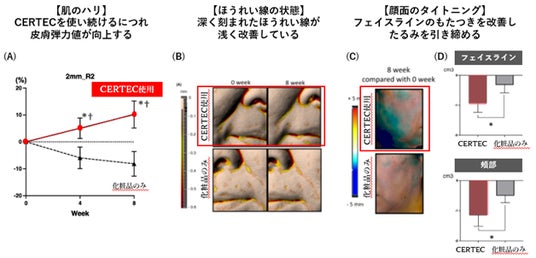 論文では「CERTEC (R)※」が顔の皮膚の弾力性を効果的に改善し、しわやたるみを減少させ血流を促進し、顔全体の見た目の若返りに寄与することが示唆されています。