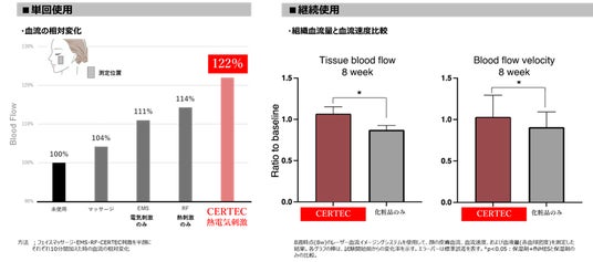 発表会では「高周波電流が血管内皮細胞の接着因子を増強させ、血管構造を安定化させる」というこれまでの研究成果と合わせて、「CERTEC (R)※」はダイナミックな形態変化を引き起こすだけではない、継続して使い続けるうちに根本的な若返り「リバースエイジング」効果をもたらす革新的な技術であると示唆されました。