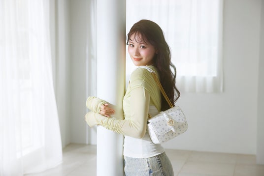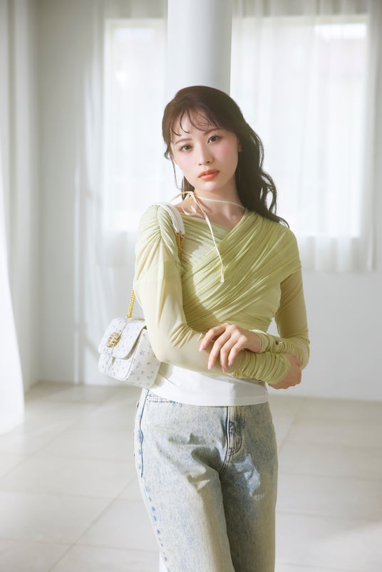 パステルイエローのトップスとデニムに合わせることで、春先取りのコーディネートに。
