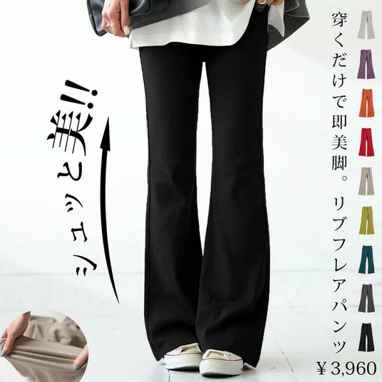 商品番号: AMA-00005 穿くだけで即美脚。思わず色違いで揃えたくなるリブフレアパンツ。