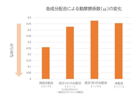 次に肌表面のなめらかさを確認するため、摩擦係数を評価しました。20℃の環境下で人工皮革シートを装着し、研究品を塗布した5分後に評価を行いました。(A)はコメ発酵成分、(B)は、エステル油です。未配合やそれぞれの成分のみを配合した処方よりも両成分を配合した処方が摩擦係数が約半分になっていることがわかりました。この結果から、両成分を配合した新処方は肌表面のなめらかさを実現しながら、保湿感も持続することがわかりました。