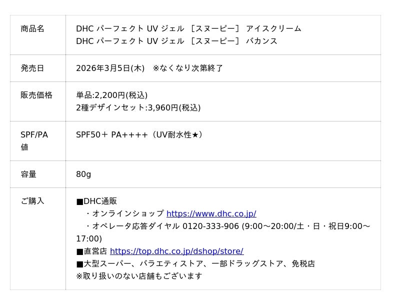 株式会社ディーエイチシー(本社:東京都港区、代表取締役社長:宮崎緑、以下:DHC)は、「スヌーピー」をデザインした日焼け止め商品として「DHC パーフェクト UV ジェル」を、2026年3月5日(木)より数量限定で発売いたしました。商品は、海やビーチといったリゾート感やバカンスをテーマとした夏らしく、かわいらしい2種類のデザインです。
