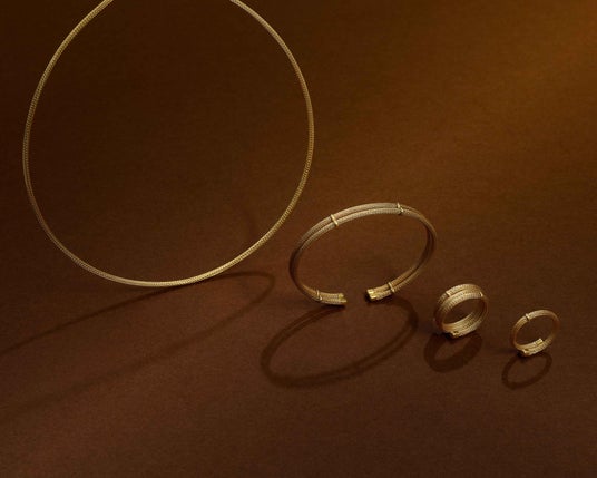 繊細なチューブに形状記憶技術を組み合わせたことで、見た目のボリュームに反して驚くほど軽く、柔軟性に富んだゴールドの丸いチューブが、肌に吸い付くように馴染みます。鱗のような編み目は、金属でありながらも織物のようなさらりとした手触り。控えめな光沢は、肌に溶け込むような落ち着いた輝きを放ちます。