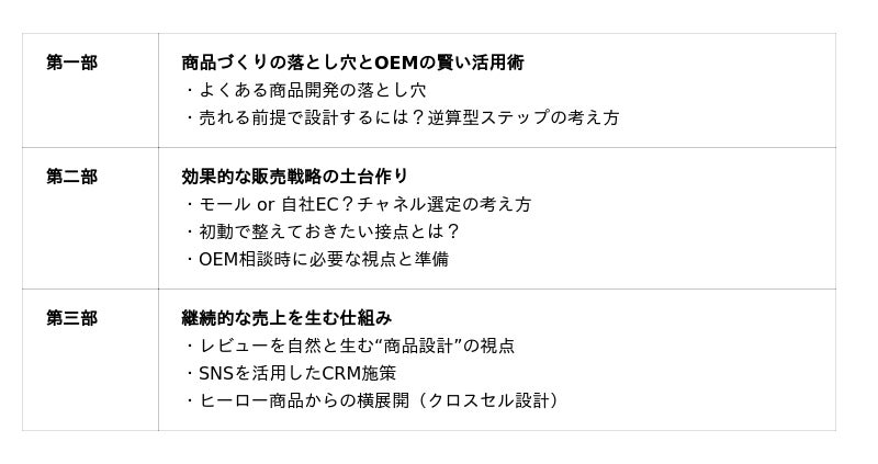 今回は、コスメ・化粧品ブランドを立ち上げたいEC事業者様、すでに事業を運営しているがより成長を目指したい方に向けて、商品開発から販売戦略、継続的な売上設計までを3部構成で解説する実践型プログラムです。