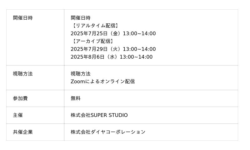 株式会社ダイヤコーポレーション(所在地:東京都新宿区 代表取締役:太田大哉)は株式会社SUPER STUDIOと2025年7月25日(金)にセミナー、「成功事例から学ぶ 立ち上げ前に知りたい『売れるEC設計』徹底解剖!」を開催致します。