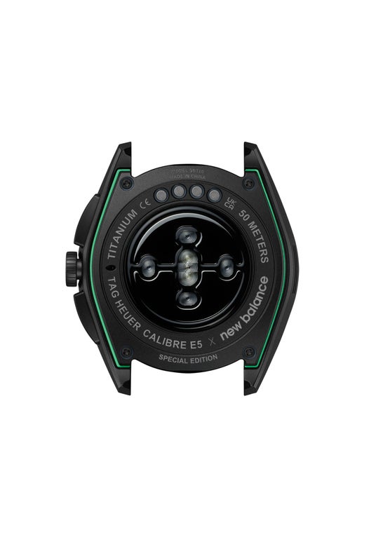 TAG Heuer Connected Calibre E5 40MM x New Balance Edition は、スイスが誇る高精度とランニングカルチャーを融合させ、モダンでありながら親しみやすい存在感を放ちます。40 mmケースは、ブラックDLCコーティングを施したグレード2チタン製。軽量でありながら高い堅牢性を誇り、毎日のトレーニングにも安心の耐久性を備えるだけでなく、腕元での快適な着用感も常にキープします。サンドブラスト仕上げがもたらすマットな質感は、モダンでアスレチックな表情を際立たせ、傷に強く、光の反射も抑えることで、あらゆる環境に適応します。