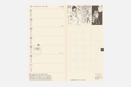 メインの週間ページには、『名探偵コナン』の原作イラストが全ページに。ほぼ日手帳weeksの使いやすいデザインはそのままに、『名探偵コナン』の原作イラストを全ページに配置しました。ほぼ日手帳の「日々の言葉」がごくたまに、キャラクターのセリフや青山先生セレクトの言葉に替わる演出も!