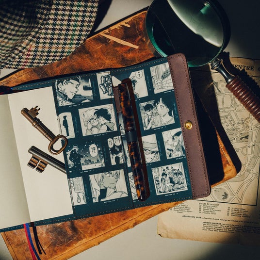 コナンも憧れる英国の名探偵の装いからイメージしたクラシカルなデザインのカバーです。内側には『名探偵コナン』から抜き出した、いくつもの名シーンが並んでいます。さらに、コミックスの裏表紙でおなじみの鍵穴をモチーフにしたポケットをご用意しました。お気に入りのカードや写真を差し込むと、鍵穴から顔を見せてくれます。
