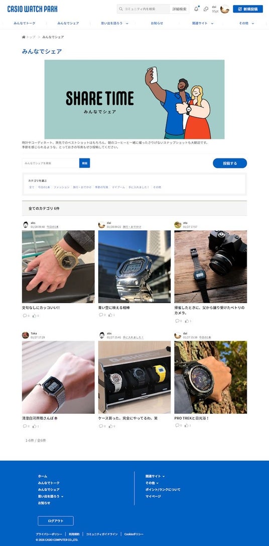 今回、新たに開設する「CASIO WATCH PARK」※1は、誰でも自由に時計に関する投稿ができるユーザー参加型のファンコミュニティサイトです。カシオの腕時計を愛用するユーザー同士がつながり、時計にまつわる体験や想いを共有し合うことで、新しい発見や楽しみ方に出会える場を目指します。