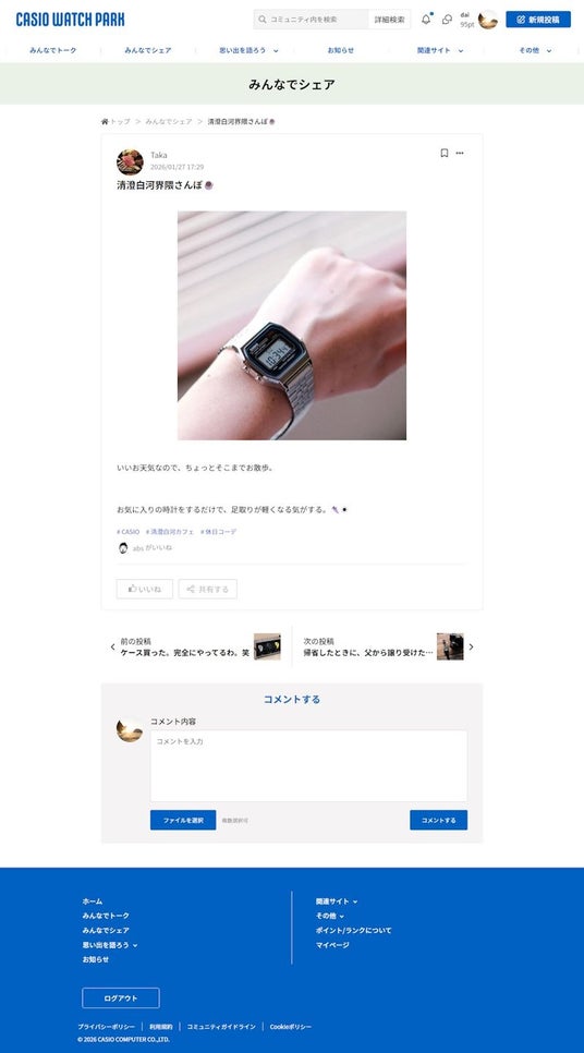 本サービスはどなたでも無料で閲覧でき、投稿機能を使用する場合は、CASIOIDのログインが必要です。投稿形式は「写真投稿」と「トーク投稿」の2種類を用意しました。「写真投稿」は時計の写真を中心に投稿する形式で、お気に入りの1本や自分の大切なコレクション、旅行先でのベストショットなど、「時計と過ごすシーン」を写真とともに共有できます。「トーク投稿」は写真添付を必須とせず、「カシオの腕時計との初めての出会い」や「時計にまつわるエピソード」など、幅広いテーマで気軽に投稿する形式です。また、他のユーザーの投稿へのコメント機能といったユーザー同士のつながりを促進する仕組みも備えています。