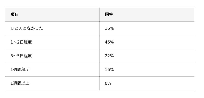 なお、「1週間以上」と回答した人はおらず、全回答者がダウンタイムは1週間以内に収まったと回答しています。
