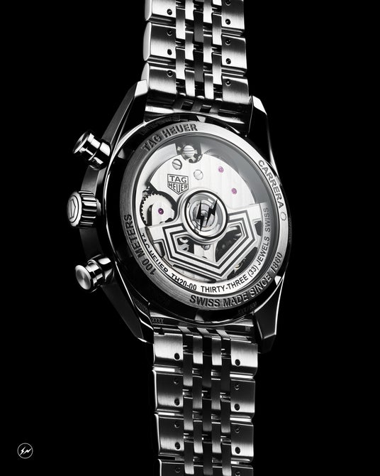 ムーブメントには、約80時間という驚異的なパワーリザーブを実現し、5年間の延長保証も適用される自社製ムーブメントTH20-00を採用。そして、フラグメント仕様に仕上げられたムーブメントデザインも、このタイムピースを際立たせる重要な要素です。タグ・ホイヤー シールドを象ったローターには、ブラックのグラフィック装飾が施され、藤原ヒロシのビジュアル言語でタグ・ホイヤーのエンブレムを再解釈。フラグメントのロゴもサファイアクリスタルに直接プリントされ、コラボならではのデザインタッチが加えられています。性能にこだわり、エンジニアリングを駆使したムーブメント構造は、コラムホイールと垂直クラッチを採用することで、クロノグラフの滑らかな動作を実現し、双方向自動巻き上げ機構により、効率的なエネルギーの流れを約束しています。