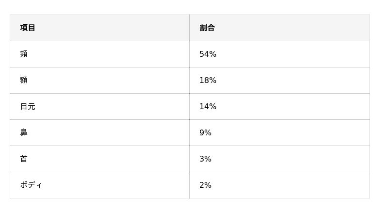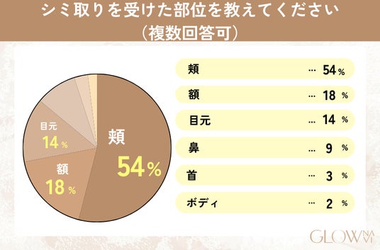 - シミ取りを受けた部位は頬54%が最多で、額18%・目元14%が続く