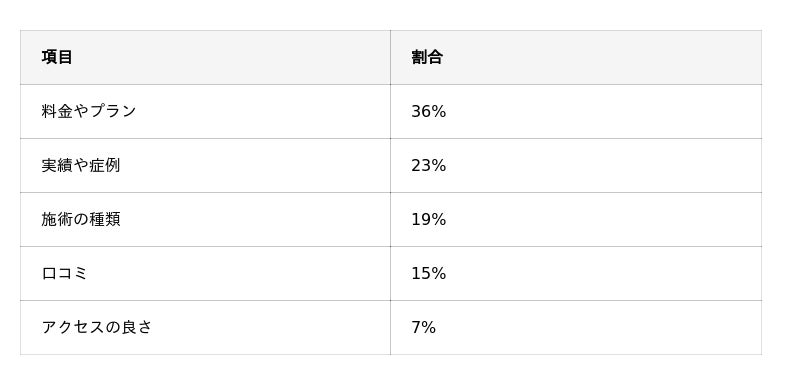 - クリニック選びの決め手は「料金やプラン」36%が最多(実績や症例23%、施術の種類19%)