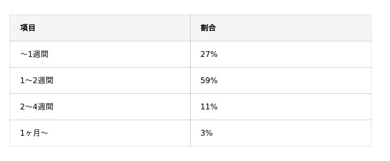 - ダウンタイムは「1~2週間」59%が最多(~1週間27%)