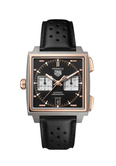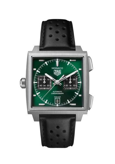 3色のカラーバリエーションで展開される今回の新作には、1971年公開の映画「栄光のル・マン」の中で、スティーブ・マックイーンが着用したことで知られるモデルから着想を得たシグネチャーカラーの「タグ・ホイヤー モナコ ブルー」が含まれています。また、洗練されたサンレイ加工サテン仕上げとラッカー仕上げを施したダークグリーンモデルは、クラシックなブリティッシュレーシンググリーンのコードを踏襲しています。さらに、エレガントなブラックモデルは、グレード5チタンと18K 5Nローズゴールドのツートーンケースに収められており、いずれのモデルも新たにデザインされたグレード5チタン製フォールディングバックルを備えたレーシングスタイルのストラップが組み合わされています。