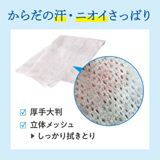ひんやり気持ちいい清涼成分メントールとヒアルロン酸(*1)やコラーゲン(*2) などの保湿成分とコンディショニング成分(*3)を配合。髪や肌でうるおして整えながらスッキリ爽快に。肌あたりやわらかな厚手シートで、汗やニオイをしっかり拭きとります。日本製。