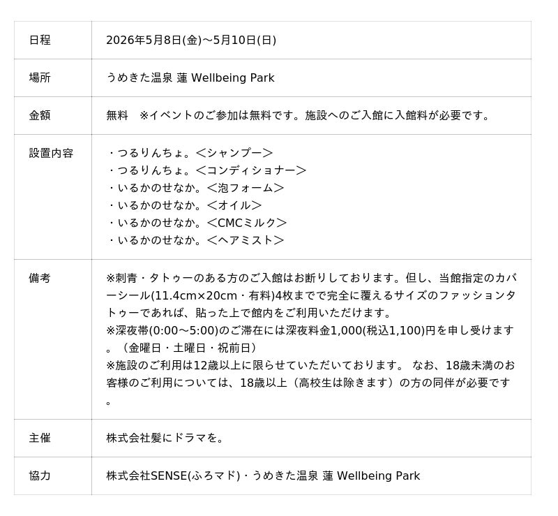 「うめきた温泉 蓮 Wellbeing Park」(総支配人:藤立 達哉、所在地:大阪市)は、美髪専門の美容師の声から生まれたヘアケアブランド「つるりんちょ。」のコラボレーションイベントを、2026年5月8日から5月10日までの期間限定で開催いたします。