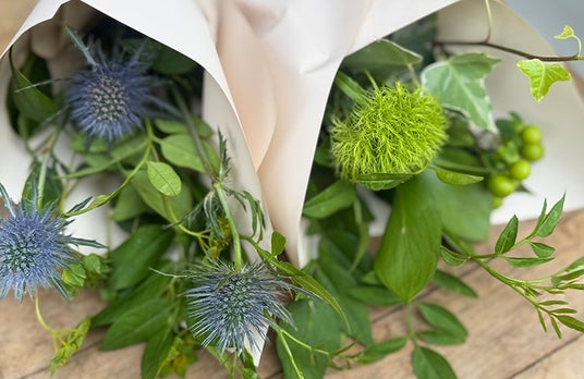ご来店のお客様にブーケをプレゼント。新しいジュエリーと美しいお花との出会いをぜひお楽しみください。
