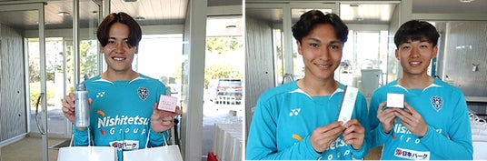 新日本製薬 株式会社(本社:福岡市、代表取締役社長CEO:後藤孝洋)は、アビスパ福岡株式会社(本社:福岡市、代表取締役社長:西野努)の選手・監督・コーチ・スタッフの皆さまへ『パーフェクトワン』商品1年分および、男性向けスキンケアブランド『TONOU(トノウ)』の新商品「トノウ 薬用デオドラントスカルプシャンプー」を贈呈いたしました。また、アビスパ福岡の北島選手と碓井選手に『TONOU』新商品をご体験いただきました。