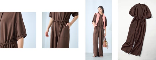 微光沢素材にふんわりとした袖を組みわせることで、シャープになりすぎない柔らかい印象に仕上げました。ウエストリボンでシルエットを調節できたり、二の腕を覆う肘まである袖丈で体型カバーが叶います。1枚でコーディネートが完成するこのオールイワンは石上さんもおすすめの一着です。