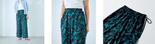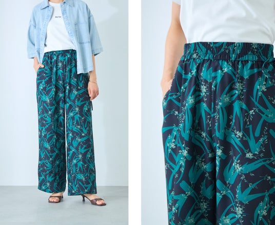 シンプルを好む大人の女性にも取り入れやすい、シックな色合いとシャープな印象のボタニカル柄が特長のプリントパンツです。左サイドのリボンがアクセントになり、手持ちのトップスと合わせるだけでコーディネートに華やかさが加わります。