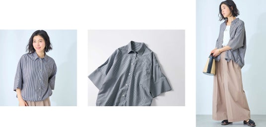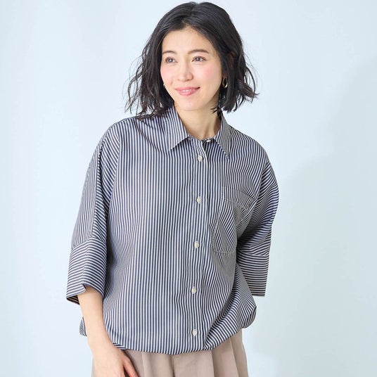 オーバーサイズのストライプシャツは、気になる二の腕をすっぽり覆う長めの袖丈と裾のドロストリング(紐)が特長です。ボトムスとのバランスに合わせて、シャツの裾を絞ってシルエットを変化させたり、タックイン風の装いにすることも可能です。身幅はゆったりしながらも 丈短め・裾絞りができるので、 バランスのいいシャツコーデが簡単に完成します。