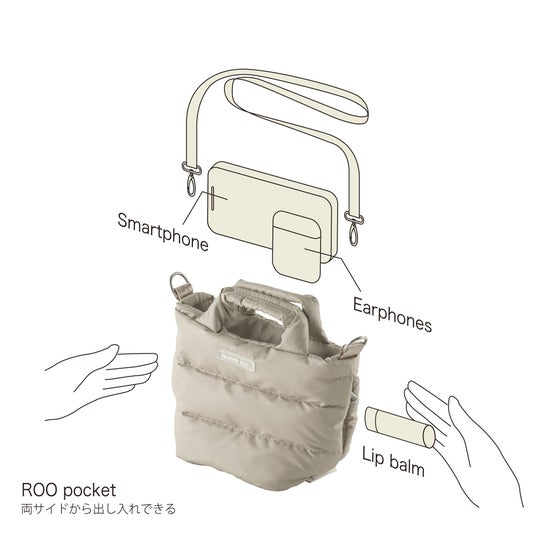 スマホやイヤホンなど、必要最低限のものを持ち歩くための小さなフェザールー。 ルーポケットはリップなどの小物収納に。 ショルダーベルト付き 2WAY仕様。