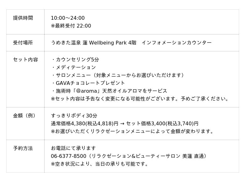 「うめきた温泉 蓮 Wellbeing Park」(総支配人:藤立 達哉、所在地:大阪市北区)は、マインドフルネス瞑想体験とリラクゼーションメニューをセットにした心身をととのえるプラン「Wellbeing Set(ウェルビーイング・セット)」を販売開始したことをお知らせします。