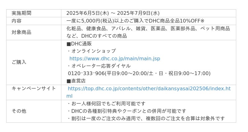 株式会社ディーエイチシー(本社:東京都港区、代表取締役社長:宮崎緑、以下:DHC)は、2025年6月5日(木)~7月9日(水)まで、日頃の感謝の気持ちを込めて「お客様大感謝祭」を開催します。