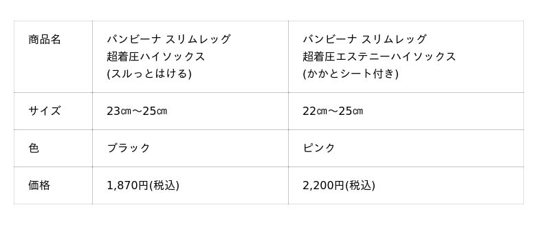 バンビーナ スリムレッグ シリーズは、強着圧でありながら脱ぎ履きしやすく一日中快適に過ごせる「超着圧ハイソックス(スルっとはける)」と、就寝時にもリラックスできるよう段階着用圧設計を施した「超着圧エステニーハイソックス(かかとシート付き)」の2種類を展開しています。