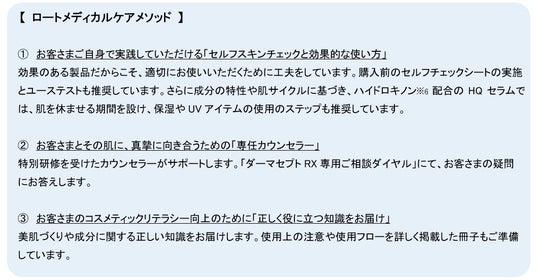 ダーマセプトRXは、当社がこれまで培ってきた機能性成分の研究開発や、皮膚科医との協業による知見をもとに、ハイリスクな成分も、正しく、適切にお使いいただくことを目指して、当社独自の販売システムである「ロートメディカルケアメソッド」を採用しています。このメソッドを通して、世の中のコスメティックリテラシー向上の一助となり、正しく適切に化粧品を選べる世の中にすることを目指しています。