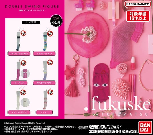 「福助 ダブルスイングフィギュア」は「.fukuske by FUKUMATSU」の特徴でもある繊細かつ複雑な編みや技巧を見事に再現したもので、実際に着用しているかのような自然なたるみやしわ感までもが表現され、生地の風合いまでもが伝わる仕上がりとなっており、それぞれ当社のCIマークでもある福助キャラクターが描かれた丸型プレートが組み合わされたダブルチャームとなっており、デザインは全6種類です。