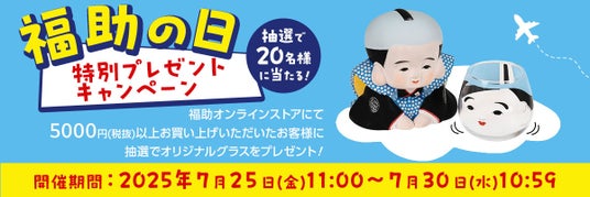 2025年7月25日(金)~7月30日(水)の期間、福助公式オンラインストア( https://www.fukuske.com/ )にて、合計5,500円(税込)以上お買い上げのお客様の中から抽選で20名様に、福助人形の顔をデザインした「福助さんゆらゆらグラス」が当たります。ゆらゆら揺れる姿が可愛らしく、七転八起をイメージさせるような縁起の良いデザインのグラスです。福助製品を日頃よりご愛顧いただいているお客さまは勿論のこと、まだお試しいただいていないお客さまにも、是非この機会をご利用いただければと存じます。