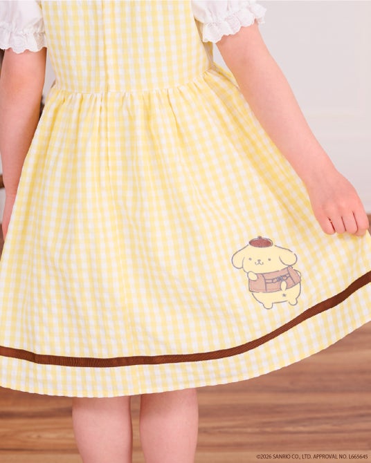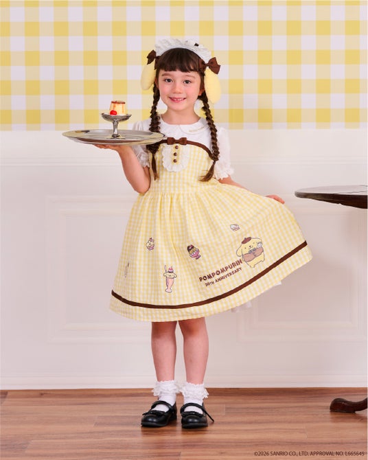喫茶店のウェイトレスをイメージしたワンピースは、ブラウスにエプロンワンピースを合わせている様なドッキングデザイン。スカート部分にはカフェのメニューとマスターのポムポムプリンのアップリケ刺繍を施し、スカートの後ろにも振り向きポムポムプリンが居るのがポイント