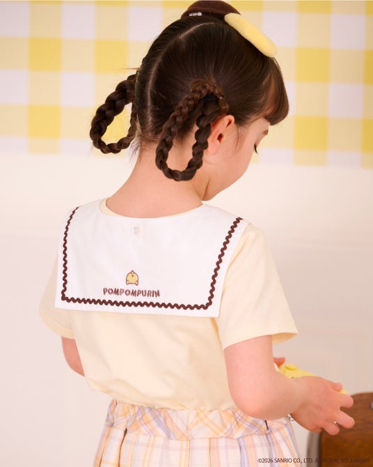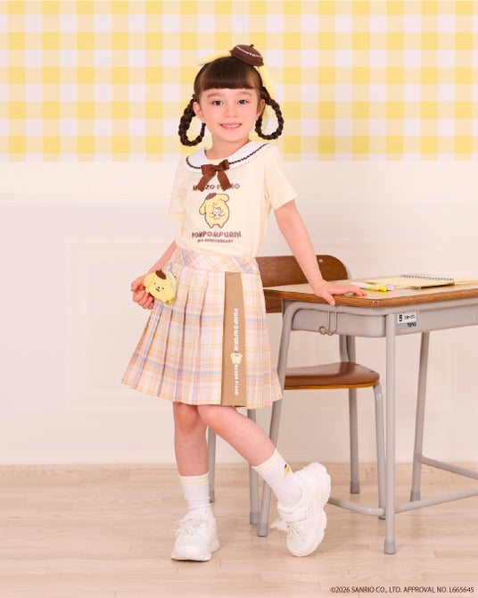 セーラーの後衿のポムポムプリンのお尻の刺繍がポイントのTシャツと、ポーチ付きのスカパンを合わせれば憧れの制服風コーディネートの完成。