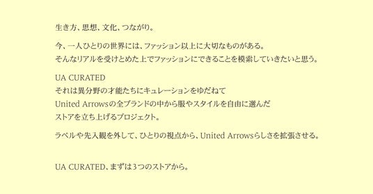 株式会社ユナイテッドアローズ(代表取締役 社長執行役員 CEO:松崎 善則、本社所在地:東京都渋谷区)は、ユナイテッドアローズの全ブランドのプロダクトから、時代に合った感性と視点でアイテムをセレクトし、新たな手法で提案するキュレーションストアプロジェクトである、「UA CURATED」を始動します。